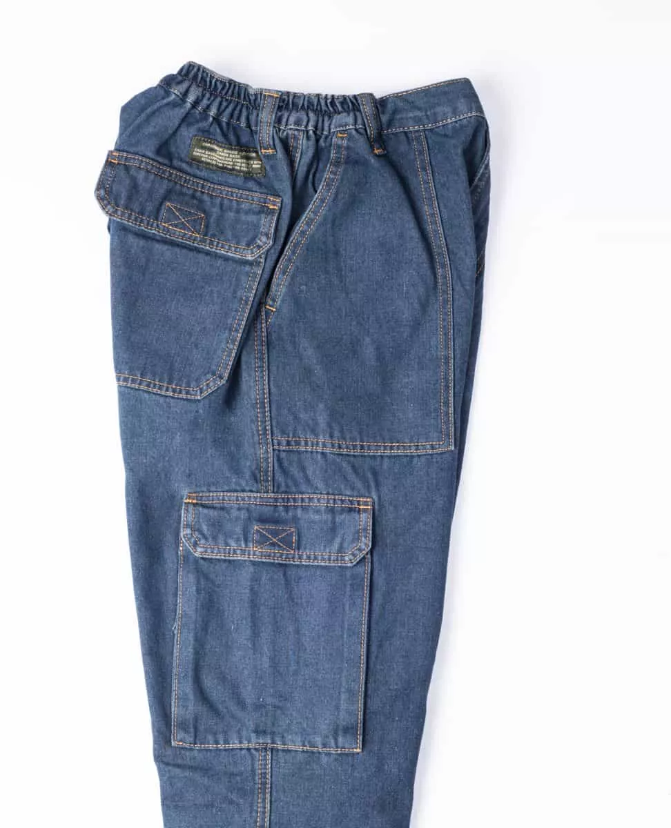 דגמח ג’ינס 6 כיסים מבד עמיד במיוחד. תפור ב-3 מחטים. עם חצי גומי מסביב למותניים.
